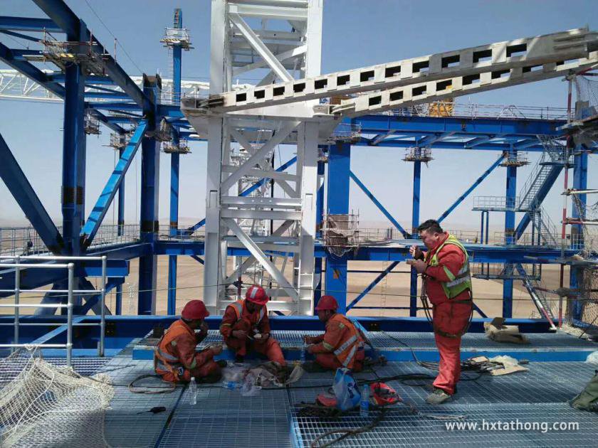 該項(xiàng)目的大板梁吊裝任務(wù)由我司提供的1臺(tái)永茂STT2630-120T和1臺(tái)永茂STT2200-80T塔機(jī)共同協(xié)作完成。作為工程的重要環(huán)節(jié)之一,鍋爐大板梁吊裝工作難度大、技術(shù)含量高,為確保安全、順利、按時(shí)地完成此次大板梁吊裝任務(wù),公司高度重視各項(xiàng)安全技術(shù)措施落實(shí),結(jié)合施工場(chǎng)地、天氣等情況制定了大板梁吊裝的專項(xiàng)施工技術(shù)方案,并進(jìn)行反復(fù)研究論證、多次優(yōu)化完善,同時(shí)加強(qiáng)過程監(jiān)督和安全技術(shù)交底工作,吊裝過程中配備了專業(yè)的安拆班組和塔司班組,分公司專職安全管理人員悉數(shù)到場(chǎng)進(jìn)行了全過程監(jiān)督,嚴(yán)格控制板梁的水平度和鋼絲繩垂直度,從起吊、轉(zhuǎn)向到變幅、調(diào)整、就位,以慢求穩(wěn),一氣呵成,順利完成了大板梁吊裝任務(wù)。