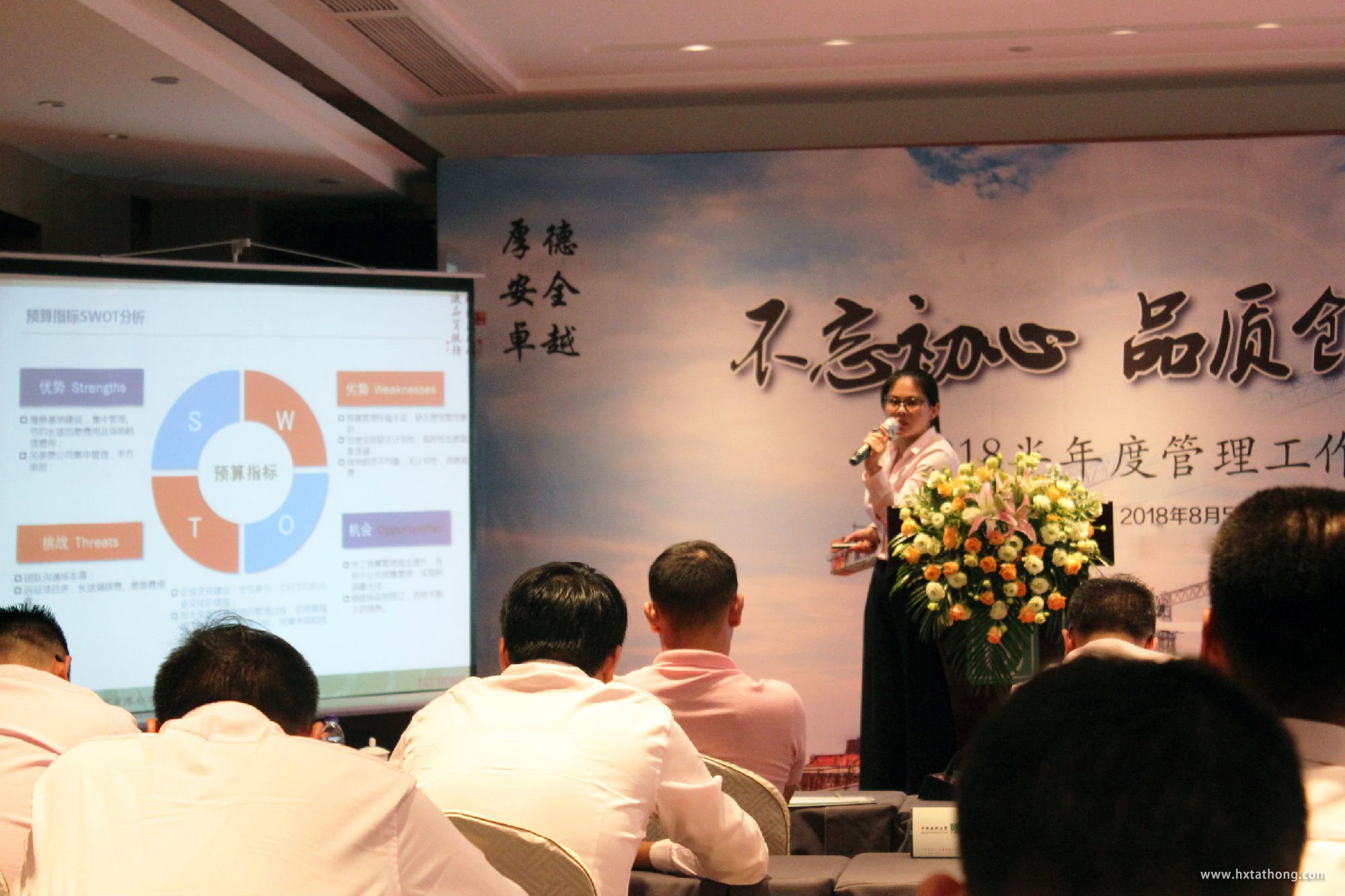 財務(wù)總監(jiān)張惠英針對上半年合同履約執(zhí)行情況及起訴項目的管控結(jié)合SWOT分析法提出建議措施,同時下達了2018年下半年度修正的預(yù)算指標(biāo);人事行政總監(jiān)尹訓(xùn)英針對近三年勞動力資源成本分析、培訓(xùn)及班前會管理、體系管理、保險管理、企業(yè)文化管理等各模塊的實施情況進行了匯報,并采用SWOT分析預(yù)算指標(biāo)控制的管控措施;總經(jīng)理助理王洋針對吊裝費預(yù)算執(zhí)行情況及西部區(qū)域經(jīng)營情況進行總結(jié)分析,運用3年的數(shù)據(jù)對比,結(jié)合SWOT方法及戰(zhàn)略分析的思路,將管控措施深入簡出的予以論述。