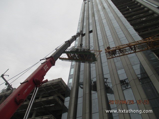 由于施工原因,該塔機安裝由5道正式附著和過程中的1道16米撐桿臨時交替附著。隨著工程的推進,最后一臺塔機也于2017年4月16日正式報停,陜西一建集團現(xiàn)場項目部及業(yè)主要求我司10天內(nèi)全部拆除并運輸完畢。由于該塔安裝使用時間長,且現(xiàn)場場地受限,降節(jié)的部附件必須在當天運輸出去,而且主體多半幕墻已安裝完成,稍有不慎就有可能碰到幕墻。這些都給拆除帶來很大的困難和風險。