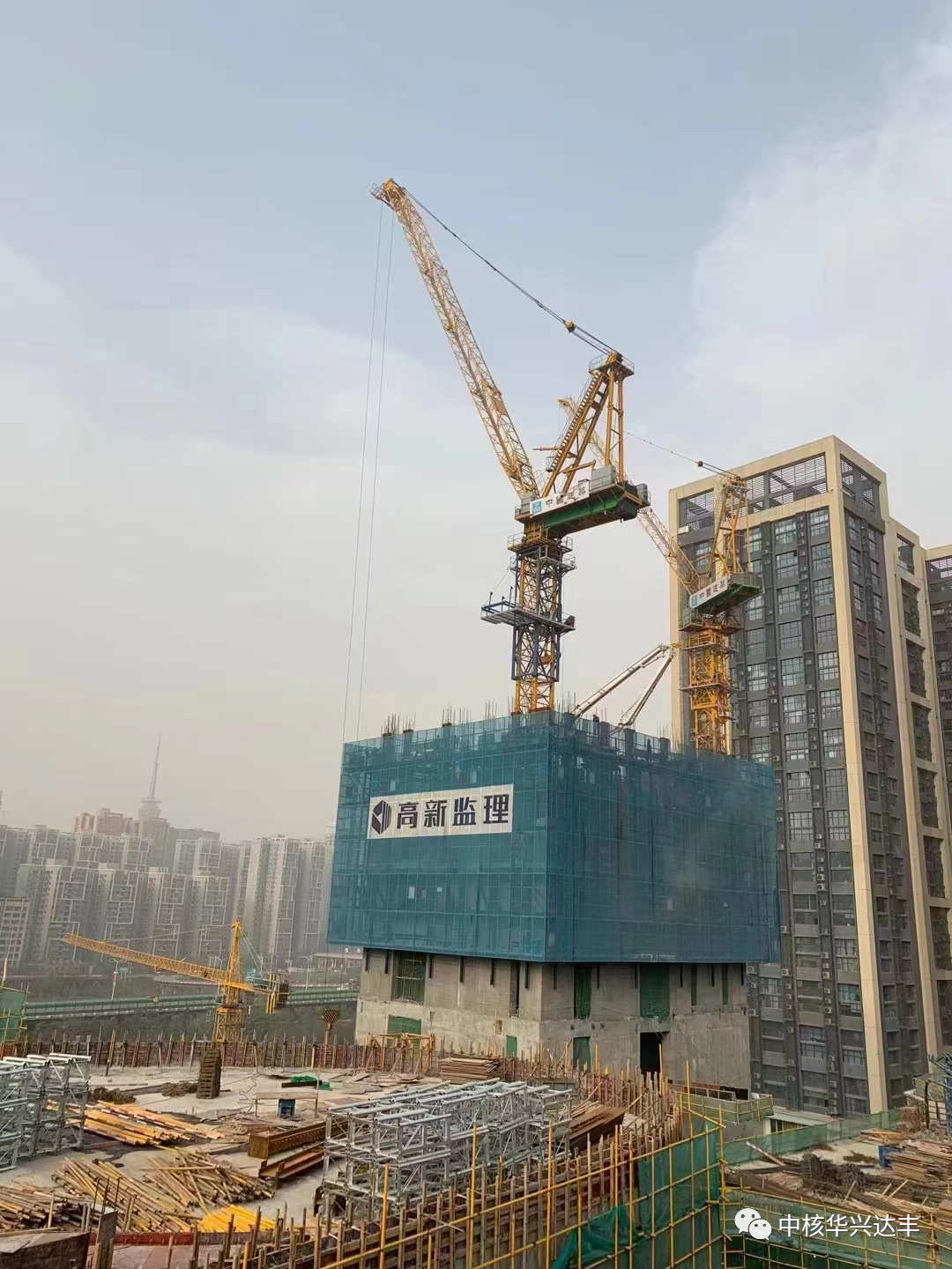 2022年8月27日,雨過天晴后,中核華興達(dá)豐西安南飛鴻項(xiàng)目頂樓上迎來一抹靚麗的橘黃色。他們正在摩拳擦掌,準(zhǔn)備開始對(duì)南飛鴻廣場(chǎng)DK-B項(xiàng)目進(jìn)行一臺(tái)永茂STL720-32t塔機(jī)拆除作業(yè)。