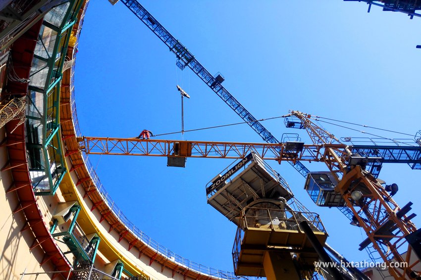 4月12日,天剛破曉,作為紅沿河核電5號機(jī)組穹頂?shù)跹b的重要協(xié)作單位,瞿鳳君經(jīng)理、安全員牛躍輝攜現(xiàn)場塔吊指揮、塔吊司機(jī)、電梯司機(jī)和維修人員等一隊(duì)人馬,隨中國核工業(yè)華興建設(shè)有限公司工作人員共同乘車進(jìn)入核電區(qū)域。工作服、安全帽、勞保鞋、勞保手套、安全帶、對講機(jī)、工具包……經(jīng)過一系列的安全交底檢查之后,中核華興達(dá)豐人員在現(xiàn)場打起了百分百的精神,斗志高昂地進(jìn)入了工作狀態(tài)。我們將C1#、C3#和C6#塔機(jī)起重臂轉(zhuǎn)至預(yù)定方向,并派指揮人員與司機(jī)共同上塔,嚴(yán)密監(jiān)控現(xiàn)場穹頂運(yùn)行的情況,確保了穹頂?shù)跹b進(jìn)入C3#塔機(jī)區(qū)域的安全,為紅沿河核電5號機(jī)組穹頂順利吊裝保駕護(hù)航!