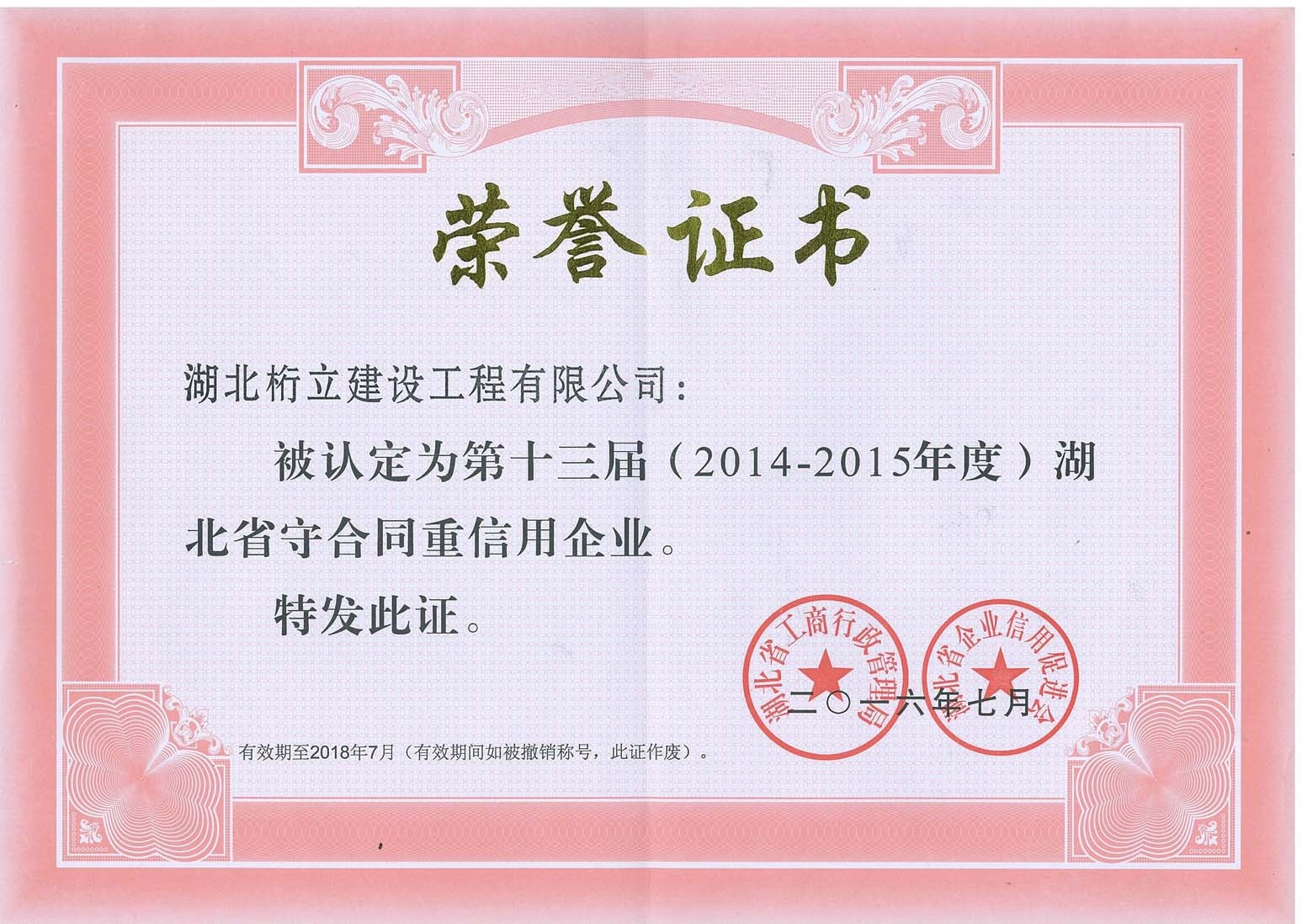 湖北省守合同重信用證書
